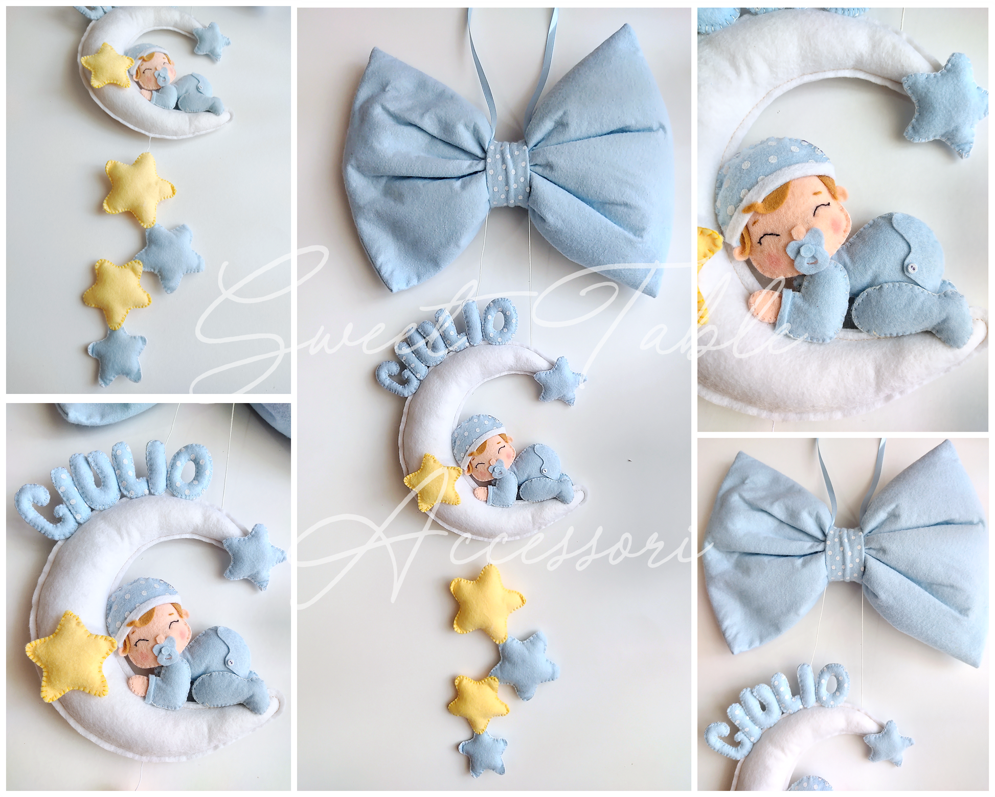 Fiocco nascita, realizzato in pannolenci composto da fiocco, luna, stelline e bimbo che dorme
