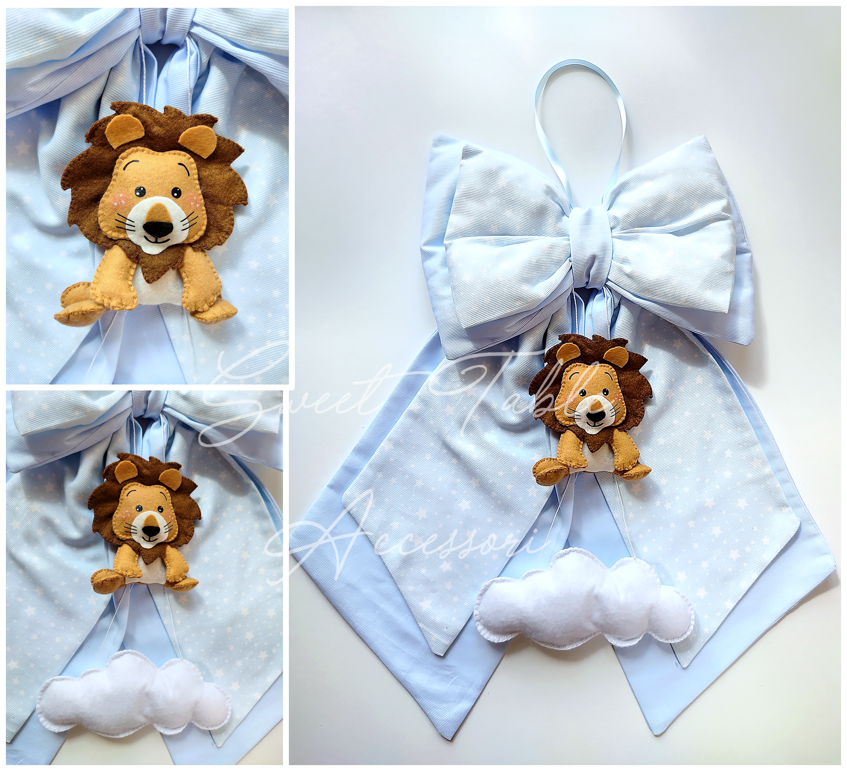 Fiocco nascita, realizzato da due fiocchi sovrapposti tinta unita e motivo a stelle decorato con un adorabile leone, completo di nuvoletta con il nome del tuo bimbo.