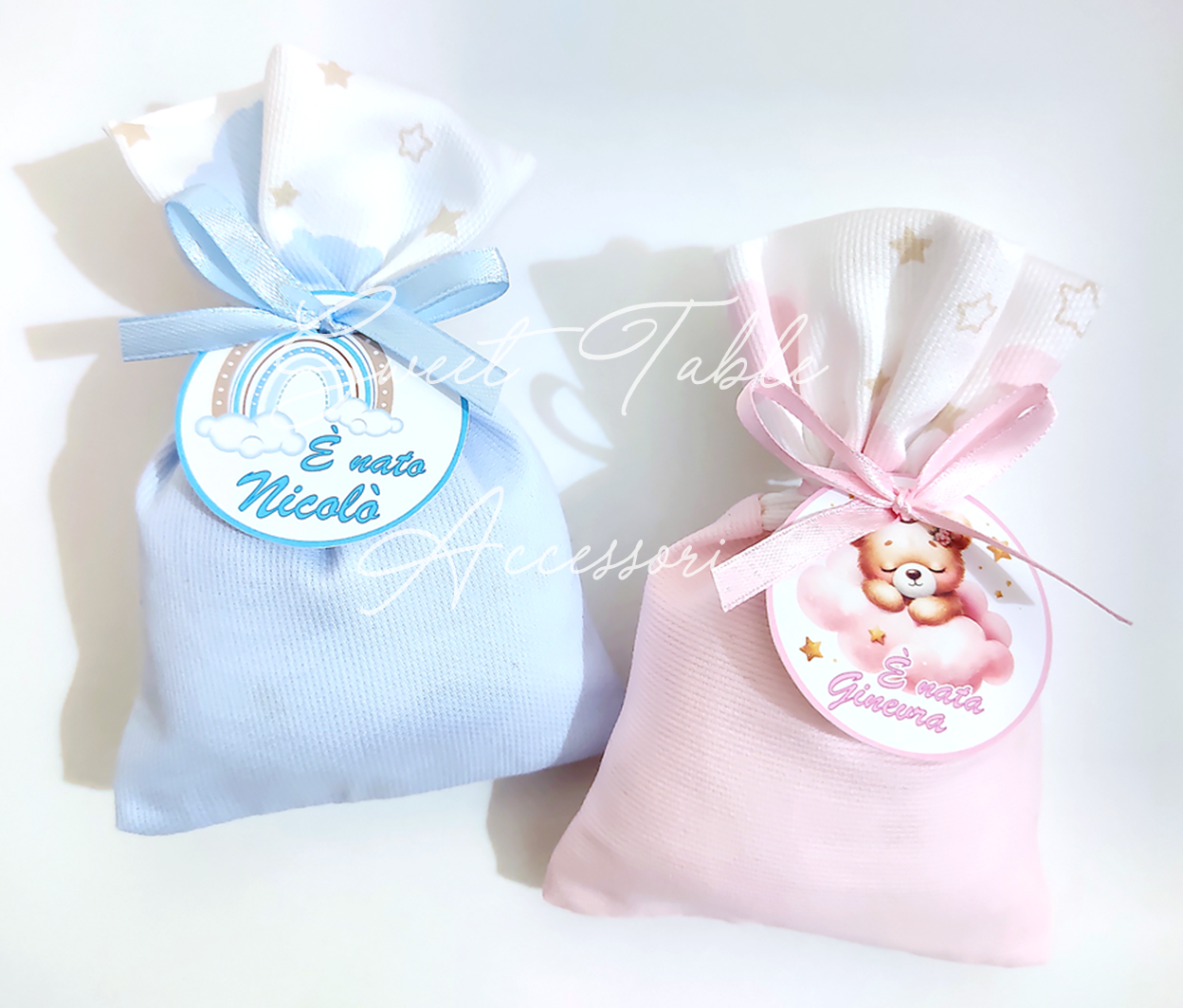 Sacchettino artigianale ideale per eventi come Battesimo e Nascita, perfetto da regalare agli invitati come segnaposto o bomboniera!! Disponibile vuoto e imbottito con ovatta o completo di confezione con 5 confetti e tag, in doppio tessuto tinta unita e fantasia.