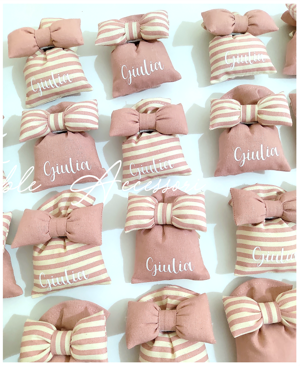 Sacchettino artigianale perfetto da regalare agli invitati come segnaposto o bomboniera!! Disponibile vuoto e imbottito con ovatta o completo di confezione con 5 confetti e tag.